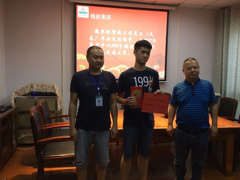 2017年7月25日下午,在強波公司會議室舉行了員工子女高考獎勵基金頒發儀式。十年樹木,百年樹人,為鼓勵員工重視子女教育,公司董事長孫波專門設立員工子女高考獎勵基金。今年,員工文春的子女文杉享受到了高考獎勵基金。